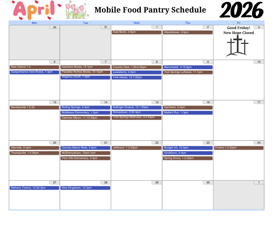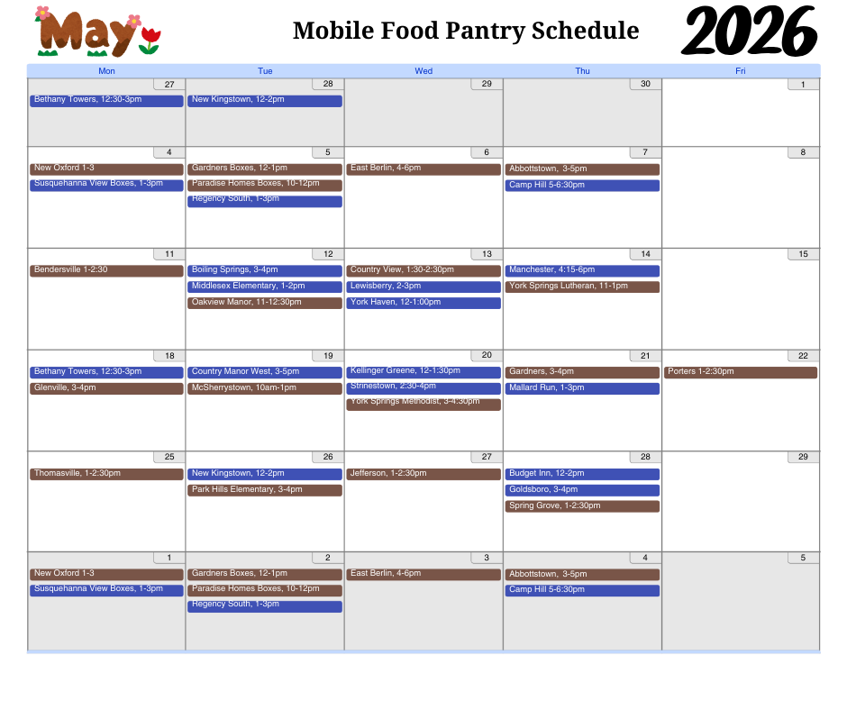 Manages mobile pantry locations highlighted in brown on calendars below.