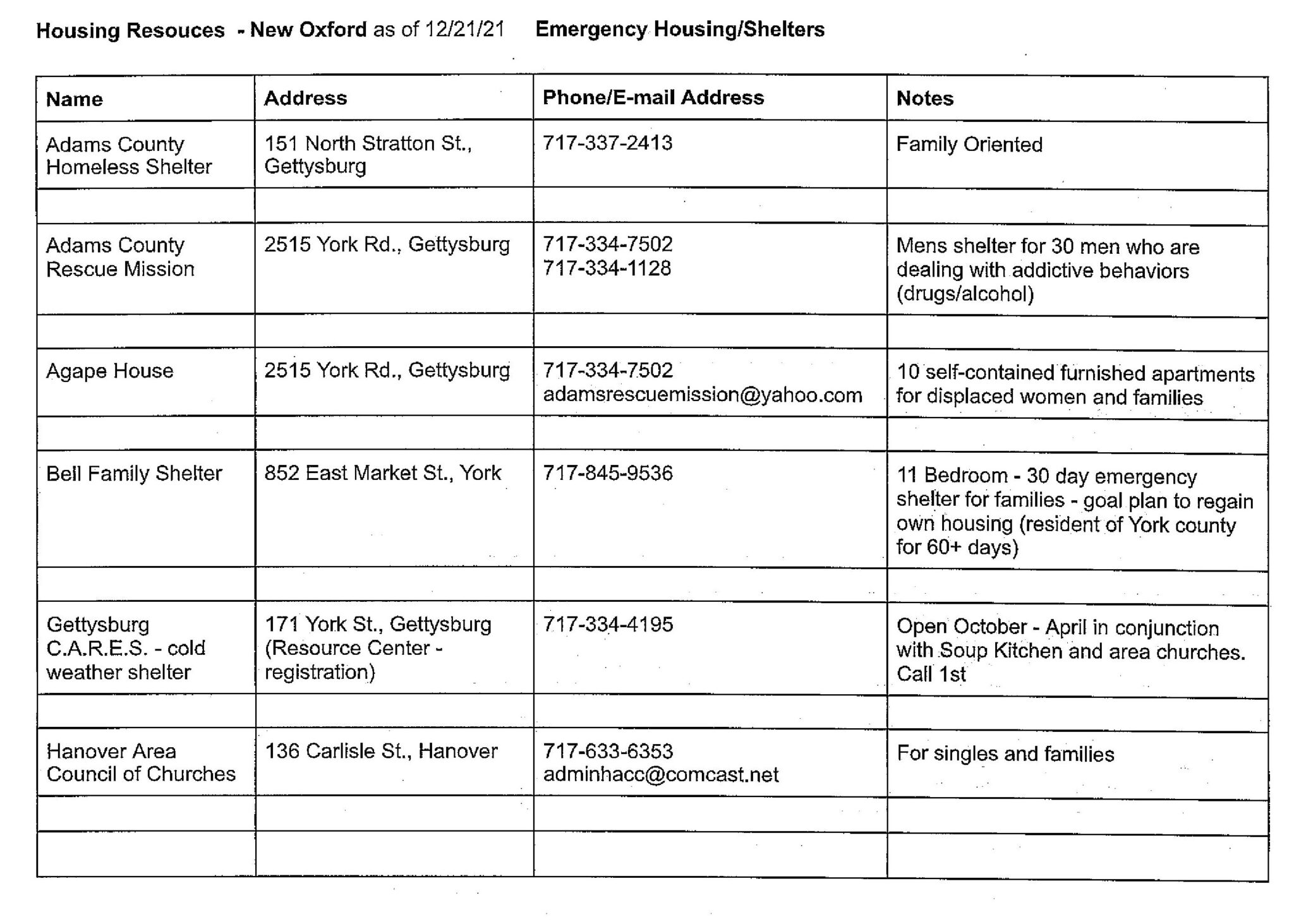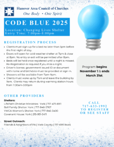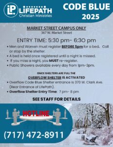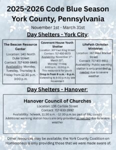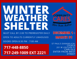The Community CARES Winter Shelter is normally open from 8:30 PM to 7:30 AM and is located at St. Paul’s Lutheran Church, 201 W. Louther Street, Carlisle. During the emergency weather period: The shelter will be open continuously (24/7) on Sunday and Monday Calling ahead to secure a spot is still required Clients must arrive by 8:30 PM Registration phone number: 717-448-8850 Food and bedding will be available throughout the extended shelter hours Additionally, the Community CARES Day Center, located at 50 W. Penn Street, Carlisle, will be closed on Sunday and Monday due to the storm. During this time, all calls should be directed to the Outreach cell phone at 717-448-8850.