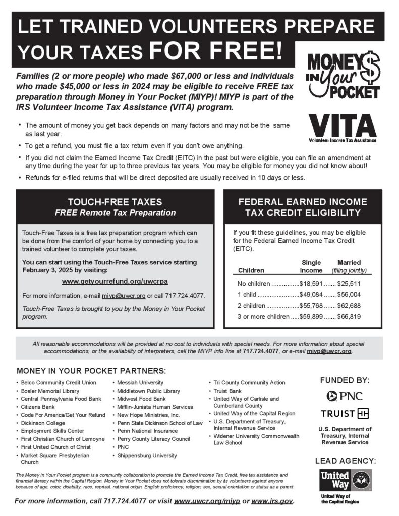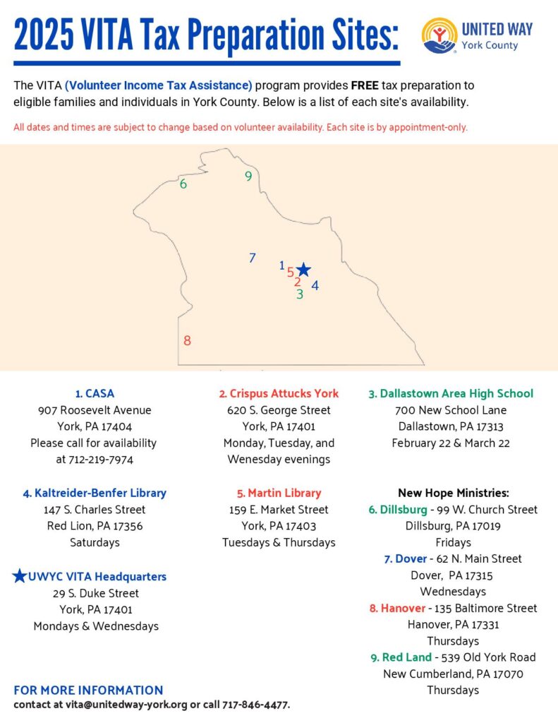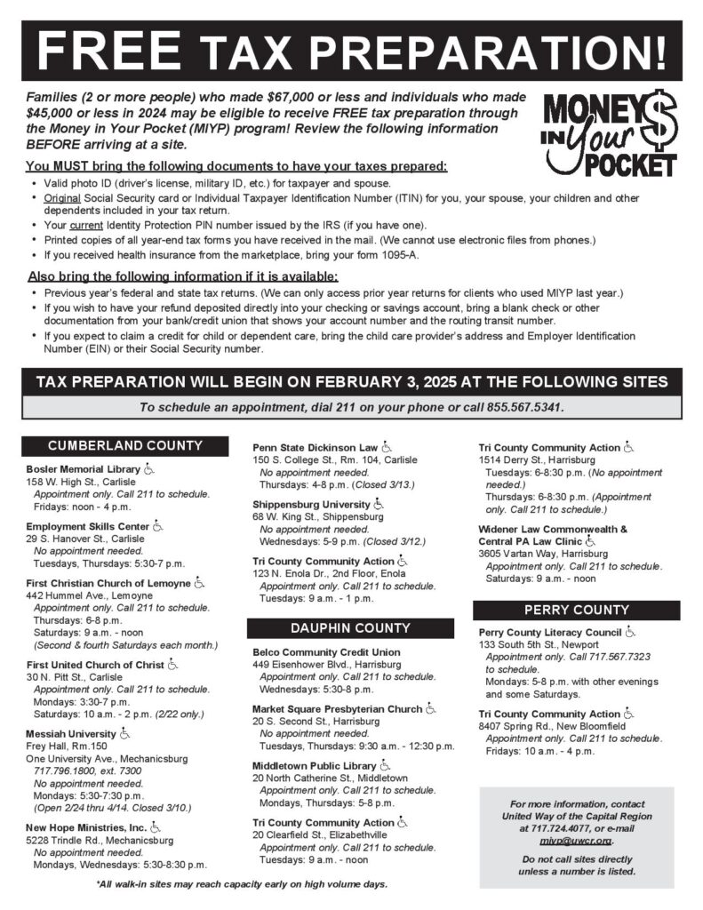 Several United Way’s in our area help provide low- to moderate-income working families with help completing federal and state tax returns. The program is available January through April.