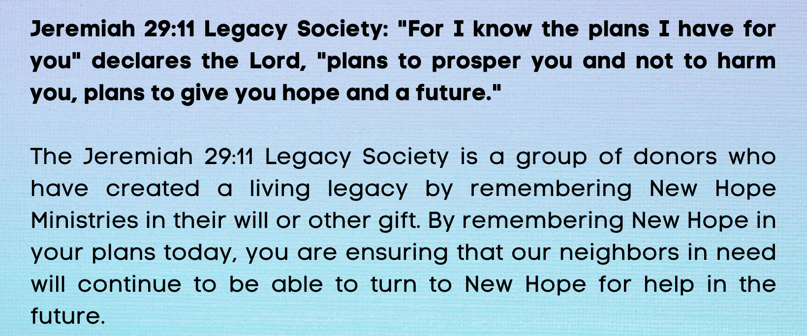 For more information about remembering New Hope Ministries during and beyond your lifetime, please contact: