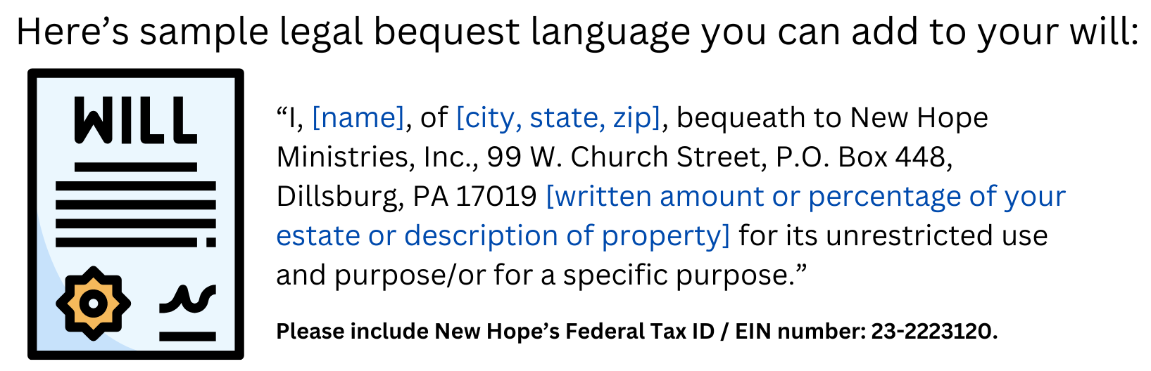 Encourage family and friends to leave gifts to New Hope Ministries in their wills.
